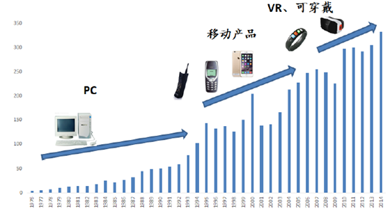 半導(dǎo)體是需求推進(jìn)的市場(chǎng),在過(guò)去四十年中,推動(dòng)半導(dǎo)體業(yè)增長(zhǎng)的驅(qū)動(dòng)力已由傳統(tǒng)的PC及相關(guān)聯(lián)產(chǎn)業(yè)轉(zhuǎn)向移動(dòng)產(chǎn)品市場(chǎng),包括智能手機(jī)及平板電腦等,未來(lái)則可能向可穿戴設(shè)備、VR/AR設(shè)備轉(zhuǎn)移。