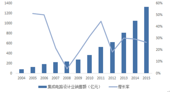 中國(guó)積極布局fabless。從銷(xiāo)售額來(lái)看,中國(guó)芯片設(shè)計(jì)業(yè)持續(xù)高速增長(zhǎng),產(chǎn)值由2004年82億元逐年成長(zhǎng)至2015年1325億元,2004~2015年復(fù)合成長(zhǎng)率達(dá)29%。