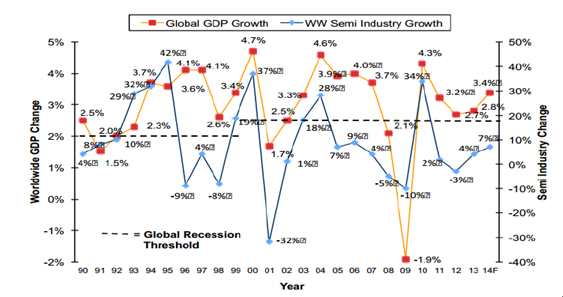 1990~2014年半導(dǎo)體市場(chǎng)增速和全球GDP增速